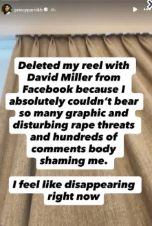 "Deleted my reel with David Miller from Facebook because I absolutely couldn't bear so many graphic and disturbing rape threats and hundreds of comments body shaming me," she wrote. The influencer shared screenshots of the abusive messages to illustrate the severity of the harassment she was facing.
