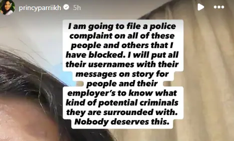 "I am going to file a police complaint on all of these people and others that I have blocked," she stated. "Nobody deserves this."