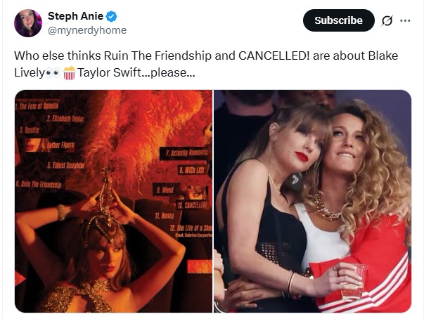 Taylor Swift notably has not publicly supported Blake Lively, as the It Ends With Us actress accused Justin Baldoni of alleged sexual harassment and also coordinating a smear campaign against her. The legal battleground and alleged shocking revelations reportedly caused Taylor to distance herself from The Age of Adaline star. Taylor Swift’s subdued public silence during the legal storm has not gone unnoticed, leading many observers to interpret her absence as significant. There have been many reports suggesting that Taylor has been reportedly hurt by Lively’s actions and the legal drama that entangled her, further fuelling the belief among netizens that the songs “Ruin the Friendship” and “CANCELLED!” may metaphorically represent this alleged “fall-out.” None of these interpretations has been confirmed by Taylor Swift or her team and remains speculative.