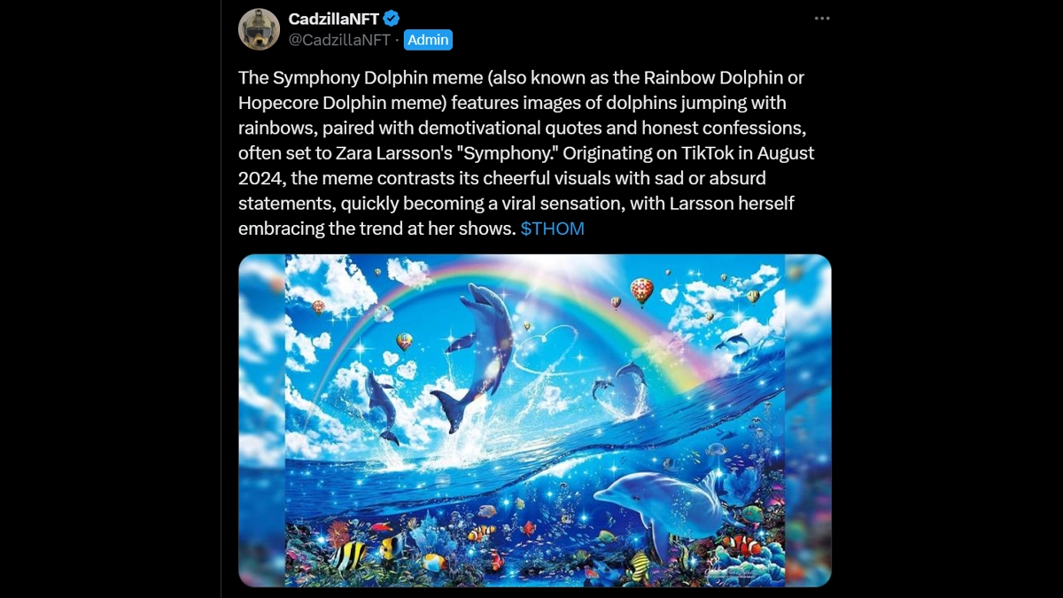 The Rainbow Dolphin meme continues to resonate with a global audience, engaging people and making the song "Symphony" trend at number 1 now. The contrast of the vibrant imagery and poignant messages is something that is making people get into this meme.