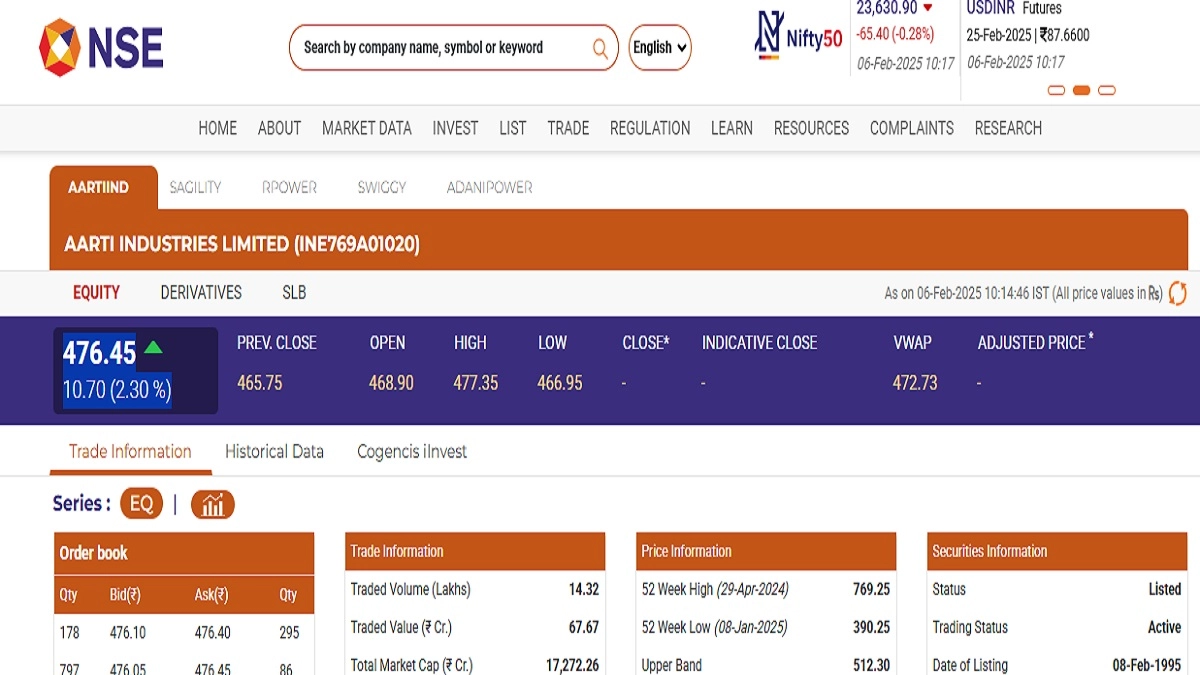 Stocks of Aarti Industries Limited (NSE: AARTIIND) opened in green in early trade today, February 6, as the stock market opened for business. Shares of Aarti Industries Limited (NSE: AARTIIND) were trading at INR 476.45 and rose by INR 10.70 or 2.30 per cent. Aarti Industries Limited (NSE: AARTIIND) saw its 52-week high of INR 769.25 on April 29, 2024. Sagility India Share Price Today, February 6: Stocks of Sagility India Limited Rise by 5%, Check Latest Price on NSE.