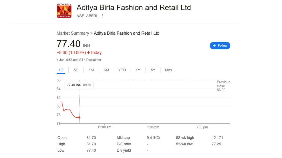 Shares of Aditya Birla Fashion and Retail Ltd (NSE: ABFRL) tumbled sharply by 10% on June 4, dropping INR 8.60 to INR 77.40 as of 9:58 AM IST. The stock opened at INR 81.70 and recorded the same level as its intraday high before slipping to a low of INR 77.40. The company’s market capitalisation currently stands at INR 9,410 crore. Tata Tech Share Price Today, June 04: Stock Dips Over 1% Amid Early Market Volatility, Check Latest Price on NSE.