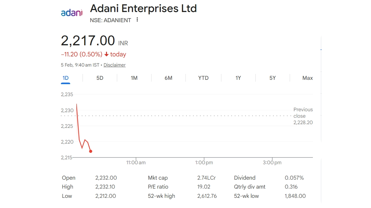Adani Enterprises Ltd (NSE: ADANIENT) was trading at INR 2,217.00 in early trade on Wednesday, down 0.50 per cent (INR 11.20) from its previous close of INR 2,228.20. The stock opened at INR 2,232.00 and touched an intraday high of INR 2,232.10 and a low of INR 2,212.00. As of 9:40 am IST, the company’s market capitalisation stood at approximately INR 2.74 lakh crore, with a price-to-earnings ratio of 19.02. Adani Enterprises has a 52-week high of INR 2,612.76 and a 52-week low of INR 1,848.00, while the stock offers a dividend yield of 0.057 per cent. Adani Enterprises Share Price Today, February 4: Stock Slips 0.19% to INR 2,198 on NSE.