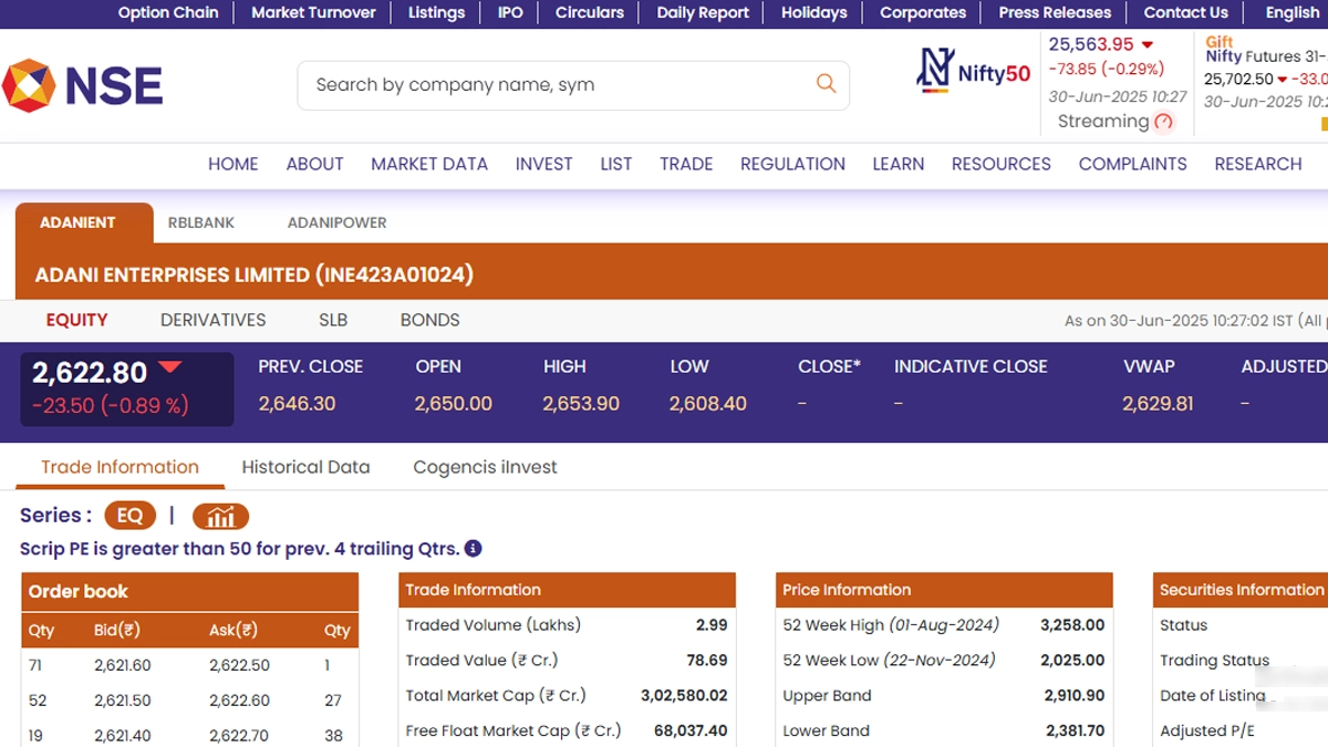 Adani Enterprises Limited (NSE: ADANIENT) stocks opened on a negative note today, June 30 as the stock market opened for trading after weekend holiday. Stocks of Adani Enterprises Limited (NSE: ADANIENT) were trading at INR 2,622.80, according to the National Stock Exchange (NSE) website. As Monday's trading session began, shares of Adani Enterprises Limited (NSE: ADANIENT) fell by INR 23.50 or 0.89 per cent. Notably, stocks of Adani Enterprises Limited (NSE: ADANIENT) saw their 52-week high and low of INR 3,258 and INR 2,025 on August 1, 2024 and November 22, 2024, respectively. RBL Bank Share Price Today, June 30: RBL Bank Limited Stocks Open in Green in Early Trade, Check Latest Price on NSE.