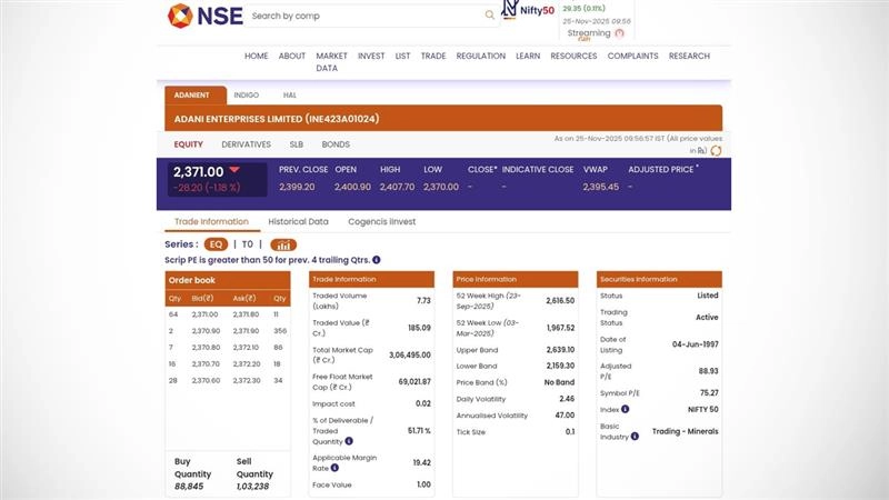 The shares of Adani Enterprise Limited (NSE: ADANIENT) tumbled on Tuesday, November 25, despite the Adani Group posting a record H1 performance with INR 67,870 crore Copex and the highest-ever Earnings Before Interest, Taxes, Depreciation, and Amortization (EBITDA). The shares of Adani Enterprise Limited (NSE: ADANIENT) were trading at 2,371 as of 10 am on November 25. Stocks to Buy or Sell Today, November 25, 2025: Sunteck Realty, Bharat Electronics and HUDCO Among Shares That May Remain in Spotlight on Tuesday.