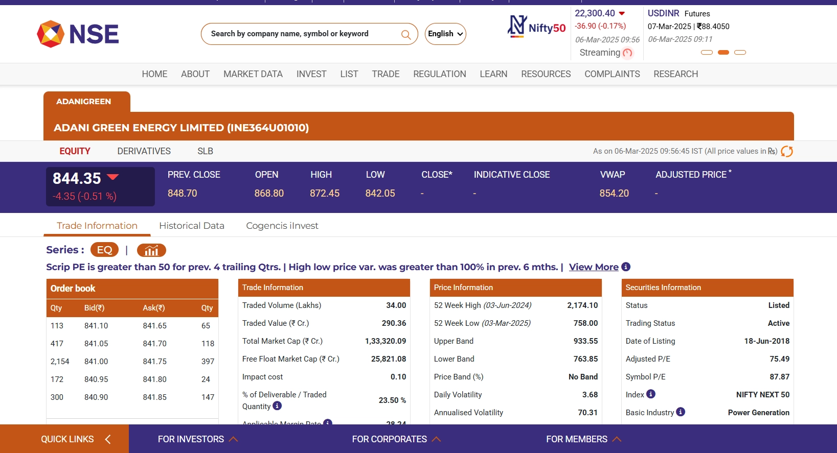 As of March 6, 2025, Adani Green share price (NSE: ADANIGREEN) stock is trading at INR 841.20, reflecting a decrease of INR 7.50 (0.88%) from the previous close. Over the past year, the stock has experienced significant volatility, with a 52-week high of INR 2,174.10 and a low of INR 840.45. The company’s market capitalization stands at INR 1,36,575 crore. Recent financials indicate a quarterly revenue decline of 22.1%, marking the lowest in the last three years. Investors are advised to monitor these developments and consult financial advisors before making investment decisions. Stocks To Buy or Sell Today, March 6, 2025: TCS, LIC Housing Finance, Wipro Among Shares That May Remain in Focus on Thursday.