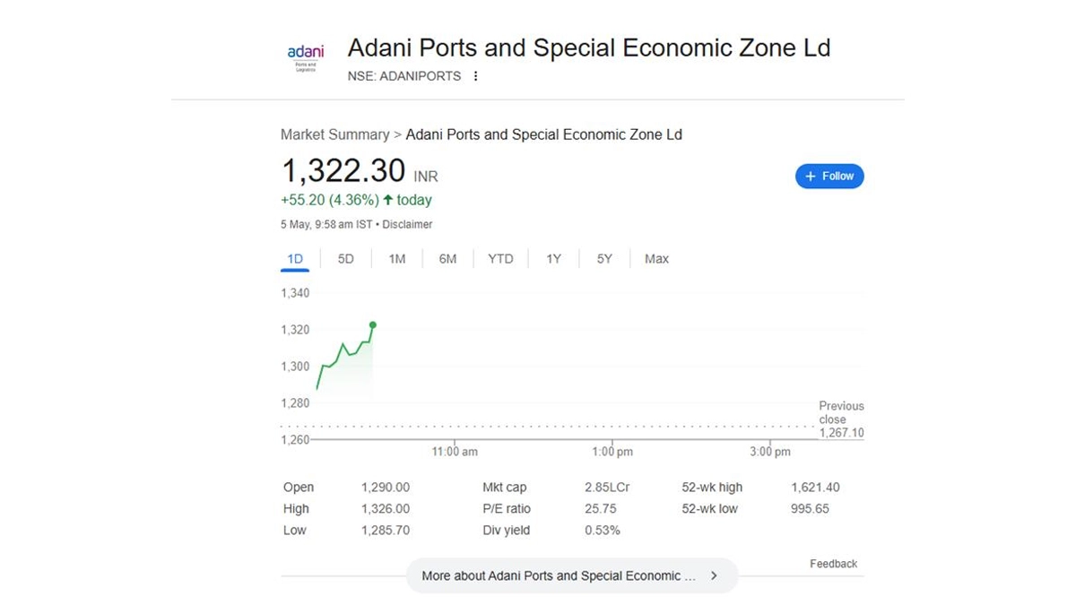 Adani Ports and Special Economic Zone Ltd (NSE: ADANIPORTS) shares surged by 4.36%, reaching INR 1,322.30 at 9:58 AM IST on May 5, 2025. This increase of INR 55.20 was driven by the company’s solid financial performance and positive market sentiment. The stock opened at INR 1,290.00, peaked at INR 1,326.00, and saw a low of INR 1,285.70 during the session. IOC Share Price Today, May 5: Stocks of Indian Oil Corporation Jump to INR 148.74, Check Latest Price at NSE.