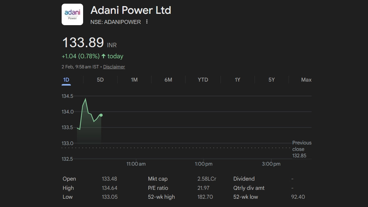 Adani Power Ltd (NSE: ADANIPOWER) saw a modest gain in early trading on Monday, 2 February, with the stock rising 0.78% to INR 133.89. The share opened at INR 133.48, reaching a high of INR 134.64 and a low of INR 133.05 in morning trade. The market capitalisation stands at INR 2.58 lakh crore, with a P/E ratio of 21.97. Analysts noted continued investor interest in power sector stocks, as the market remains attentive to the upcoming Budget announcements. Adani Power Share Price Today, February 1.