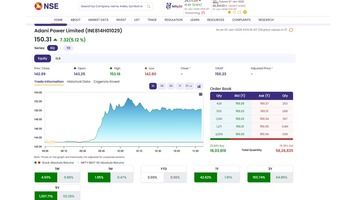 Shares of Adani Power Limited witnessed a strong start to the new year on January 1, 2026, outperforming the broader market in early trade. The stock opened at INR 143.25 and surged to an intraday high of INR 153.16 on the National Stock Exchange (NSE). As of 11:04:35 AM IST, Adani Power shares were trading at INR 150.31, marking a significant increase of INR 7.32 or 5.12% from the previous close of INR 142.99. The company’s long-term performance remains robust, with the stock delivering a massive 1,397.71% return over the past five years and 150.74% over the last three years. The Nifty 50 index was also trading in positive territory at 26,171.05, up 41.45 points (0.16%). For Adani Power, the Volume Weighted Average Price (VWAP) currently stands at 150.23, reflecting strong buying interest as the total buy quantity reached 18,03,619 shares during the morning session. Tata Steel Share Price Today, January 1, 2026: Stocks of Tata Steel Limited Rise by 0.41% in Early Trade; Check Latest Price on NSE.