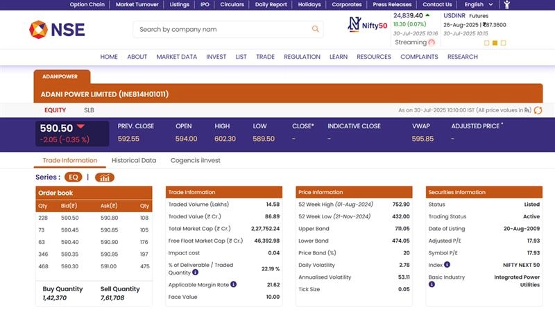 Adani Power Ltd (NSE: ADANIPOWER) shares opened at INR 594.00 on Wednesday, July 30, slightly above the previous close of INR 592.55. By 10:15 AM, the stock was trading lower at INR 590.50, down 0.35% in early trade. The dip comes ahead of the company’s board meeting scheduled for August 1 to consider its first-ever stock split. The proposed corporate action involves dividing shares with a face value of INR 10, aimed at enhancing stock liquidity and affordability. This marks Adani Power’s first step towards such shareholder-friendly measures, as it has never issued a bonus or split shares before. Despite the decline, the stock remains well above its 52-week low of INR 432.00. Stocks To Buy or Sell Today, July 30, 2025: NTPC, L&T and Bank of India Among Shares That May Remain in Spotlight on Wednesday.