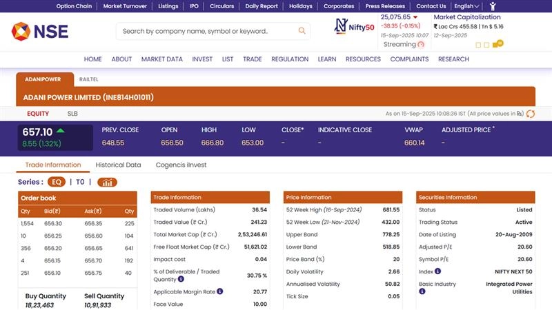 Shares of Adani Power Ltd (NSE: ADANIPOWER) edged higher on Monday, September 15, following news of a long-term power project agreement. The stock opened at INR 656.50, up from its previous close of INR 648.55, and by 10:10 AM, it was trading at INR 657.10, gaining 1.32% in early trade. The rise comes as Adani Power signed a 25-year pact with Bihar State Power Generation Company for a 2,400 MW greenfield project in Pirpainti, projected to generate up to 12,000 jobs during construction. The stock remains below its 52-week high of INR 681.55 recorded on September 16, 2024, while the 52-week low stands at INR 432.00 from November 21, 2024. Railtel Share Price Today, September 15: Railtel Shares Surge 8% After Company Secures Another Order From Bihar Council; Check Latest Price on NSE.