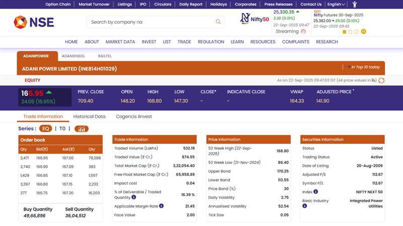 Shares of Adani Power Ltd (NSE: ADANIPOWER) surged sharply on Monday, September 22, ahead of the company’s stock split record date, attracting strong investor interest. The stock opened at INR 148.20, up from its previous close of INR 709.40, and by 9:45 AM, it was trading at INR 165.95, gaining 16.95% in early trade. The surge follows Friday’s rally, when Adani Power shares jumped 13.42% to close at INR 716.10. The stock has delivered significant returns, rising over 20% in a month and 37.16% in six months, and surging 1,856.56% historically. The board recently approved a 1:5 stock split, reducing the face value from INR 10 to INR 2, with the company currently holding 385.69 crore fully paid-up equity shares. The 52-week high stands at INR 168.80, while the 52-week low is INR 86.40, highlighting significant volatility and growth potential in the stock. Stocks to Buy or Sell Today, September 22, 2025: TCS, Wipro, and Infosys Among Shares That May Remain in Focus on Monday.