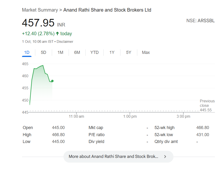 Anand Rathi Share and Stock Brokers Ltd (NSE: ARSSBL) surged to INR 457.95, up INR 12.40 (2.78%) as of 10:06 AM IST on October 1, 2025. The company recently launched an INR 745 crore issue for subscription from September 23 to 25, which saw overwhelming interest—subscribed 20.66 times overall. The Qualified Institutional Investors portion was subscribed 43.8 times, Non-Institutional Investors 28.6 times, and Retail Investors 4.78 times. With over 30 years of experience, Anand Rathi offers full-service broking, margin trading, and distribution of financial products across equities, derivatives, commodities, and currency markets. Serving retail, HNIs, UHNI, and institutional clients, the company continues to strengthen its position in India’s financial services sector. Stocks to Buy or Sell Today, October 01, 2025: Adani Total Gas, Lupin, Indian Overseas Bank Among Shares That May Remain in Focus on Wednesday.