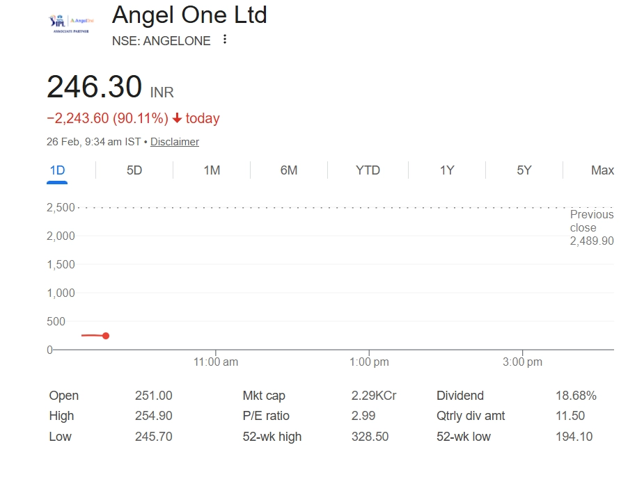 Angel One share price (NSE: AngelOne) appeared to plunge nearly 90 percent in early trade on February 26 after the stock turned ex-split. On the NSE, Angel One Ltd (NSE: ANGELONE) was quoted at INR 246.20 at 9:35 am IST, down INR 2,243.70 or 90.11 percent. However, the sharp fall reflects a price adjustment following the 1:10 stock split and not an actual erosion of investor wealth. As per the corporate action, each equity share with a face value of INR 10 has been subdivided into 10 equity shares of INR 1 each. Investors holding the stock as of the record date, February 26, will receive nine additional shares for every one share held. While the share price adjusts proportionately, the overall investment value remains unchanged. The split is expected to enhance liquidity and improve retail participation. Stocks To Buy or Sell Today, February 26, 2026: Tata Capital, Sanofi India and IRFC Among Shares That May Remain in Spotlight on Thursday.