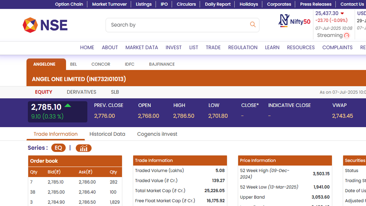 Angel One Limited (NSE: ANGELONE) stocks opened in green today, July 7, as soon as the stock market opened for business. According to the latest stock market updates, shares of Angel One Limited (NSE: ANGELONE) were trading at 2,785.10. Stocks of Angel One Limited (NSE: ANGELONE) saw a growth of INR 9.10 or 0.33 per cent. Notably, Angel One Limited (NSE: ANGELONE) shares saw their 52-week high of INR 3,503.15 on December 9 last year. HDB Financial Share Price Today, July 7: Stocks of HDB Financial Services Limited Fall by INR 11.45 in Early Trade, Check Latest Price on NSE.