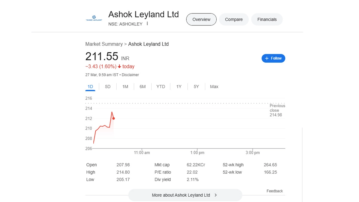 Ashok Leyland Ltd ( NSE: Ashokley ) saw a 1.52% decline in its stock price, trading at INR 211.71 as of 10:00 AM IST on March 27. The stock opened at INR 207.98, reaching an intraday high of INR 214.80 and a low of INR 205.17. With a market capitalization of INR 62,220 crore, the company has a P/E ratio of 22.02 and a dividend yield of 2.11%. Over the past year, Ashok Leyland’s stock has fluctuated between a 52-week high of ₹264.65 and a 52-week low of INR 166.25. Motherson Share Price Today, March 27: Stocks of Samvardhana Motherson Drop 4.39% in Early Trade, Check NSE Latest Price.