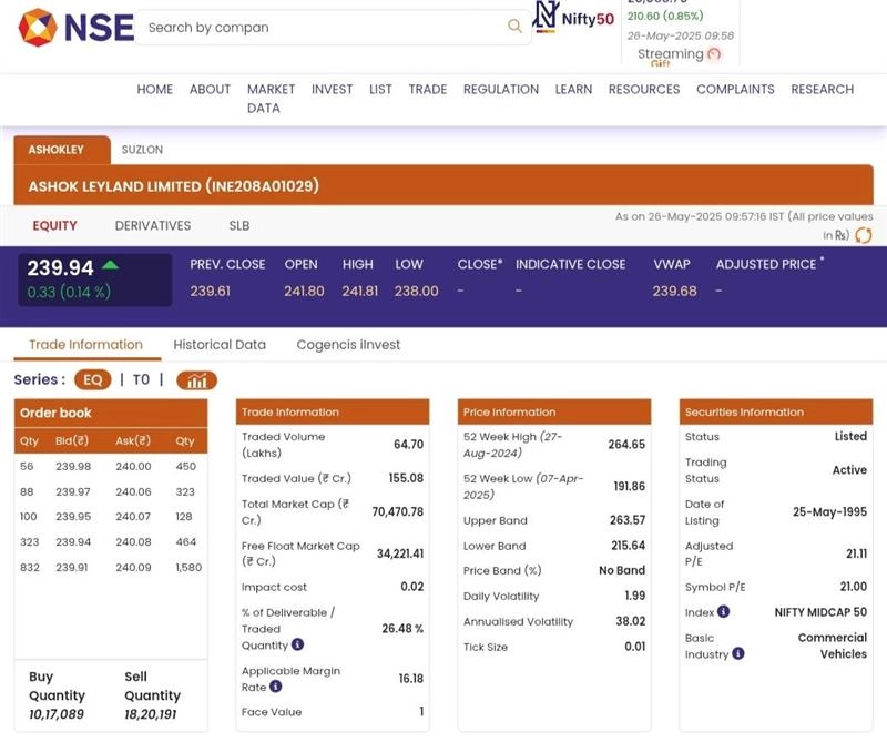 As the Indian stock market opened for trading on Monday, May 26, Ashok Leyland Limited (NSE: ASHOKLEY) stocks opened in the green. According to the National Stock Exchange (NSE), shares of Ashok Leyland (NSE: ASHOKLEY) were trading at INR 239.94 and rose by INR 0.33 or 0.14 per cent. Suzlon Energy Share Price Today, May 26: Stocks of Suzlon Energy Limited Rise by 4.42%, Check Latest Price on NSE.