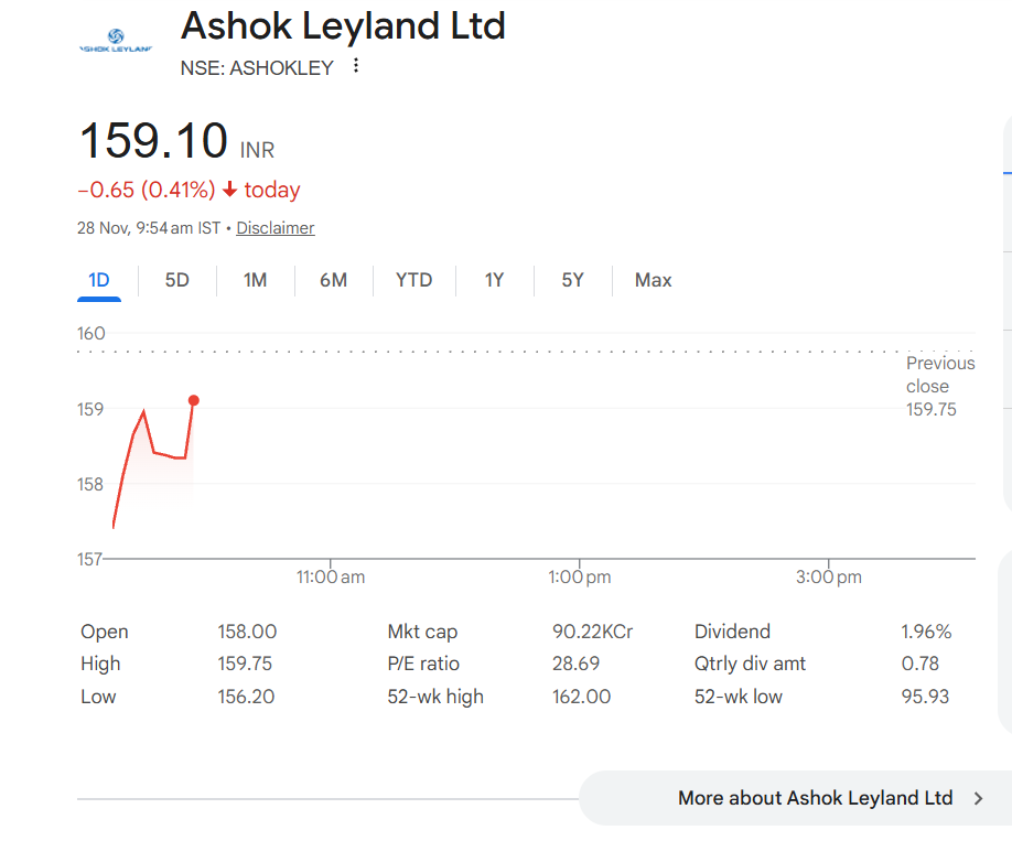 Ashok Leyland Ltd share price (NSE: AshokLey) traded mildly in the red on November 28, with the share price at INR 159.01, down INR 0.74 (0.46%) at 9:55 am IST. The stock’s slight decline comes amid mixed sentiment in the broader auto sector, where investors are closely tracking demand trends, festive sales impact and production updates. While no major company-specific triggers emerged in early trade, cautious market conditions and sectoral consolidation contributed to the marginal dip in Ashok Leyland’s share performance. Indian Stock Market Creates History As Sensex Smashes 86,000 for 1st Time, Nifty Hits New Record.