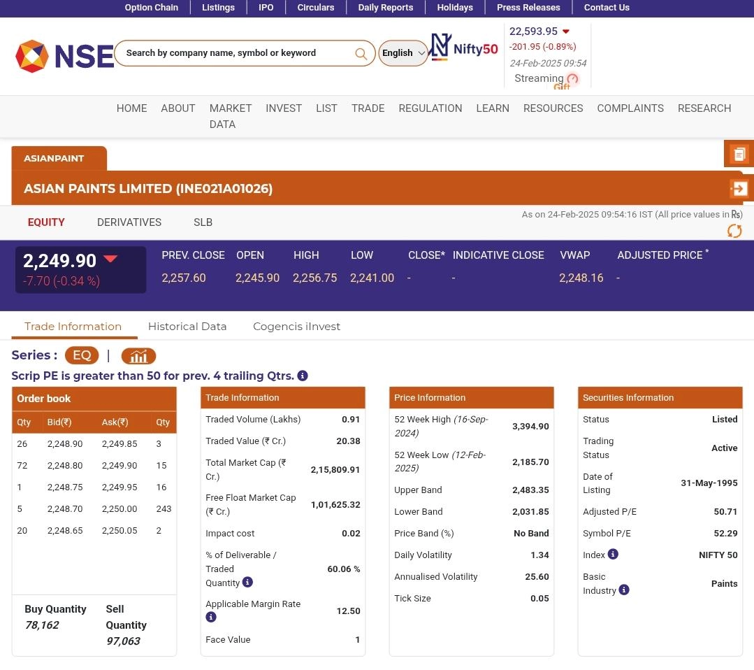 The stocks of Asian Paints (NSE: ASIANPAINT) fell by 0.34% on Monday, February 24. On the first trading day, the price per share of Asian Paints Limited (NSE:ASIANPAINT) was at 2,249, down by 7.70. BSE Sensex and Nifty50, the Indian equity benchmark indices, tanked in opening trade on Monday. Stocks To Buy or Sell Today, February 24, 2025: Zomato, Adani Green Energy and RailTel Among Shares That May Remain in Spotlight on Monday.