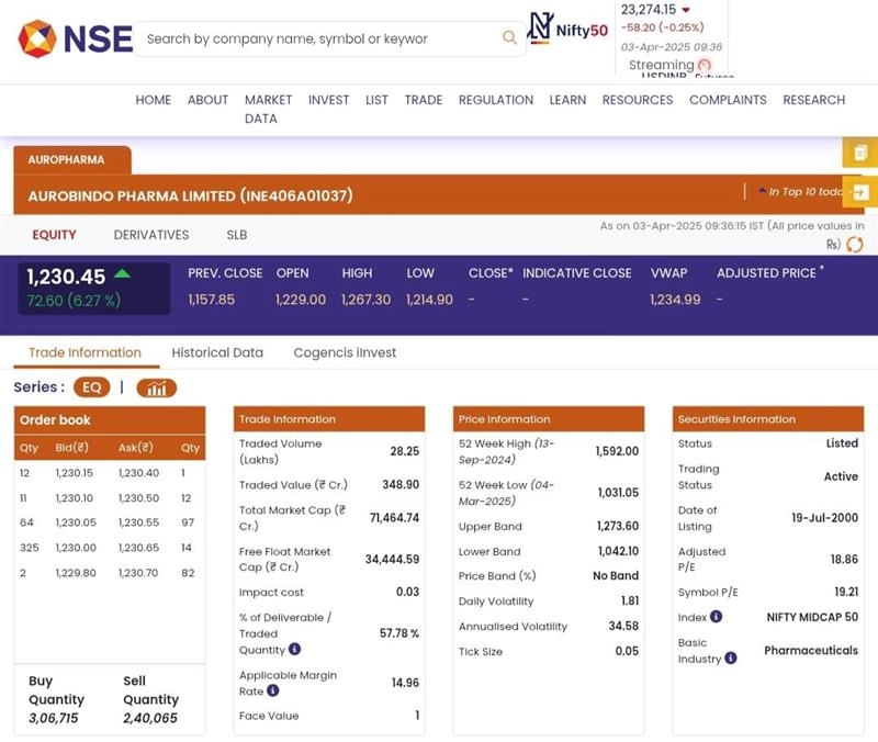 Shares of Aurobindo Pharma (NSE: AUROPHARMA) opened on a positive note on Thursday, April 3, as soon as the stock market opened for business. According to the National Stock Exchange (NSE) website, stocks of Aurobindo Pharma (NSE: AUROPHARMA) were trading at INR 1,230 and increased by INR 72.60 or 6.27%. Stocks To Buy or Sell Today, April 03, 2025: Reliance Industries, PNB, Chennai Petroleum Among Shares That May Remain in Focus on Thursday.