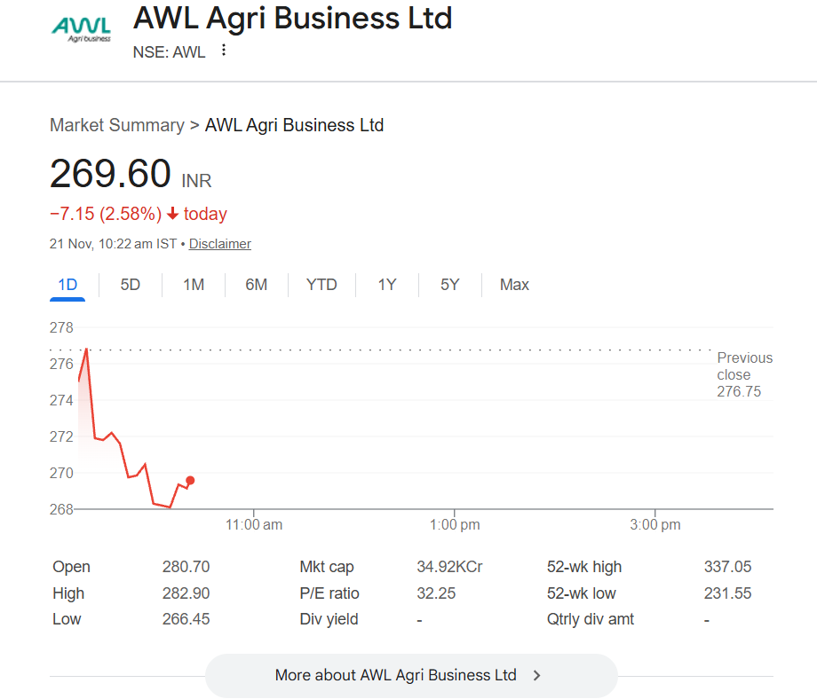 AWL Agri Business Ltd (NSE: AWL) traded at 269.85 INR, slipping 6.90 INR (2.49%) as of 10:22 am IST on November 21. The stock declined after the Adani Group executed a block deal to offload its remaining 7% stake, marking a complete exit from the company. The clean-up trade was carried out by Adani Commodities LLP, a subsidiary of Adani Enterprises. The full divestment from the former Adani Wilmar weighed on investor sentiment, contributing to today’s dip in the share price. The move concludes the conglomerate’s phased withdrawal from the edible oil major, with markets reacting to the final stake sale. Stocks to Buy or Sell Today, November 21: TCS, Reliance Industries Limited, and Hyundai Motor Among Shares That May Remain in Spotlight on Friday.