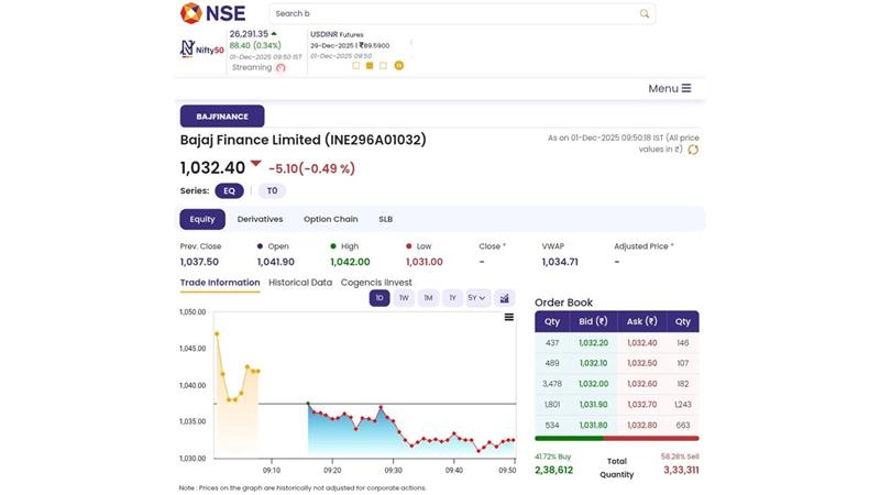 Shares of Bajaj Finance Limited (NSE: BAJFINANCE) tumbled on Monday, December 1, 2025. Bajaj Finance is trading -0.89% lower at INR 1,028.45 as compared to its last closing price. Bajaj Finance has been trading in the price range of 1,044.85 & 1,027.15. Bajaj Finance has given 52.27% this year & 3.33% in the last 5 days. Bajaj Finance has a TTM P/E ratio of 33.84 as compared to the sector P/E of 30.32. Stocks to Buy or Sell Today, December 1, 2025: ICICI Bank, Neuland Laboratories and Waaree Energies Ltd Among Shares That May Remain in Focus on Monday.