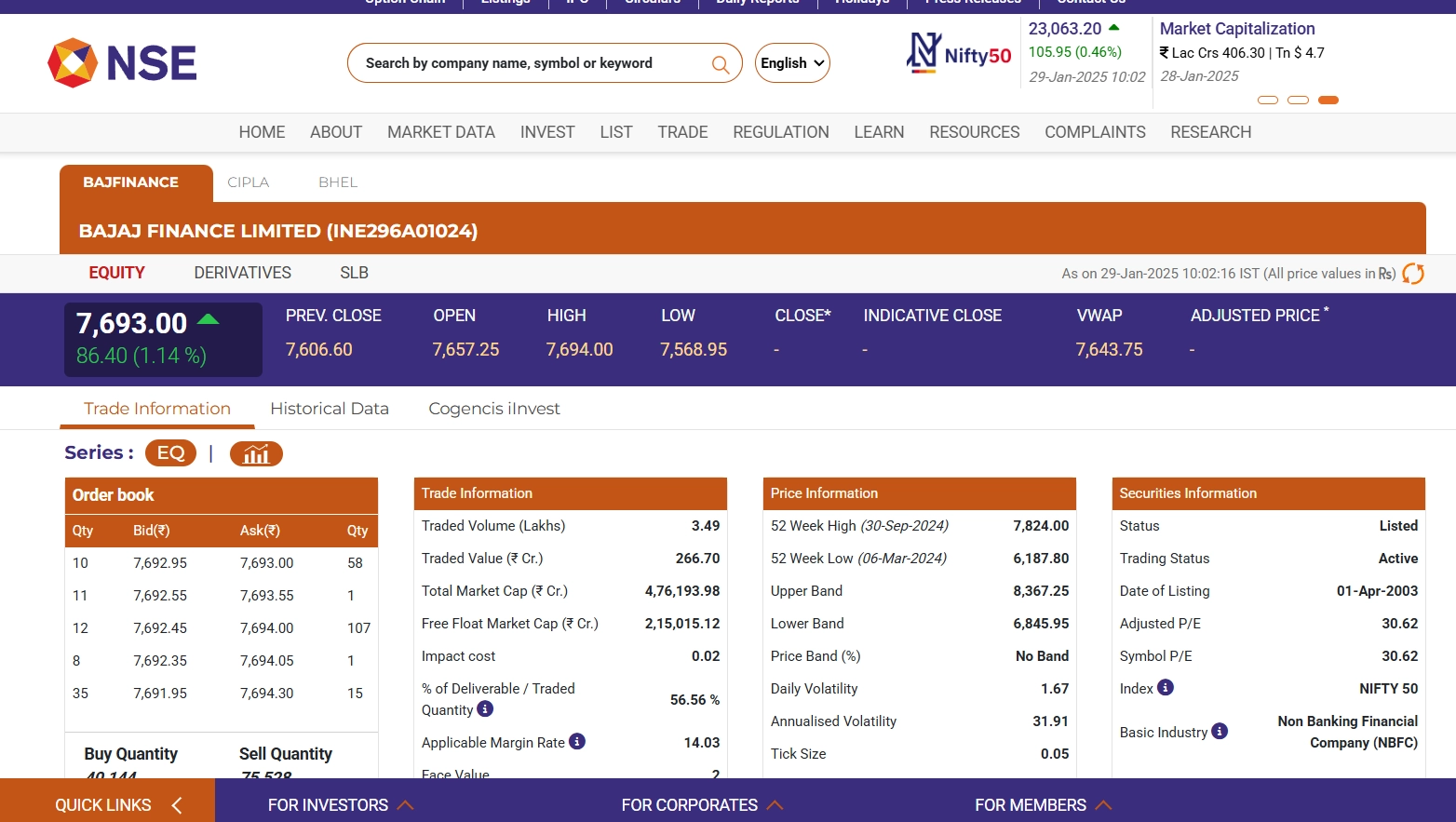 Bajaj Finance Limited’s share price (NSE: BAJFINANCE) saw a positive uptick on January 29, rising 1.14% to trade at INR 7,693, up INR 86.40 in early trading. The financial services giant continues to attract investor interest, reflecting optimism in the sector. Analysts are closely monitoring the stock amid broader market trends and company performance. Bajaj Finance has been a key player in the NBFC sector, and its movement today indicates steady investor confidence. Further fluctuations are expected as the trading session progresses. Stocks To Buy or Sell Today, January 29, 2025: Bajaj Auto, BHEL, and Suzlon Energy Among Shares That May Remain in Spotlight on Wednesday.