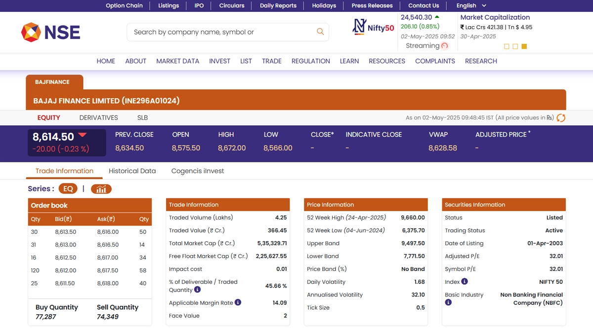Shares of Bajaj Finance Ltd (NSE: BAJFINANCE) declined by 0.23 % today, May 2, trading at INR 8,614.50, down from the previous close of INR 8,634.50. The slide follows the company's announcement on April 29 of a 4:1 bonus issue of shares and a 1:2 stock split, marking its first bonus issue in nine years. The company stated that both actions reflect its strong financial position and positive growth outlook. The bonus issue and stock split are set to take place on or before June 27, subject to necessary approvals. Despite the positive announcement, investor sentiment remained cautious, and the stock saw a slight dip. Bajaj Finance's 52-week high stands at INR 9,660.00, and its low at INR 6,375.70. Stocks To Buy or Sell Today, May 02, 2025: Tata Motors, Hyundai Motor India and Eternal Among Shares That May Remain in Spotlight on Friday.