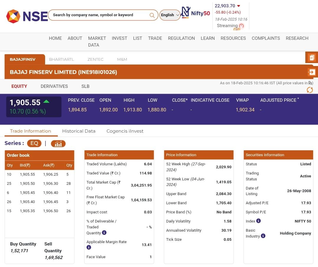 Bajaj Finserv (NSE: BAJAJFINSV) share price was up by 0.56% in early trade on Tuesday, February 18. Bajaj Finserv shares rose as much as 0.56% to INR 1905.55 apiece on the NSE. The stock has delivered a robust 20.98% return over the past year. Bharti Airtel Share Price Today, February 18: Stocks Indian Telecom Plunges by 0.63%, Check Latest Price on NSE.