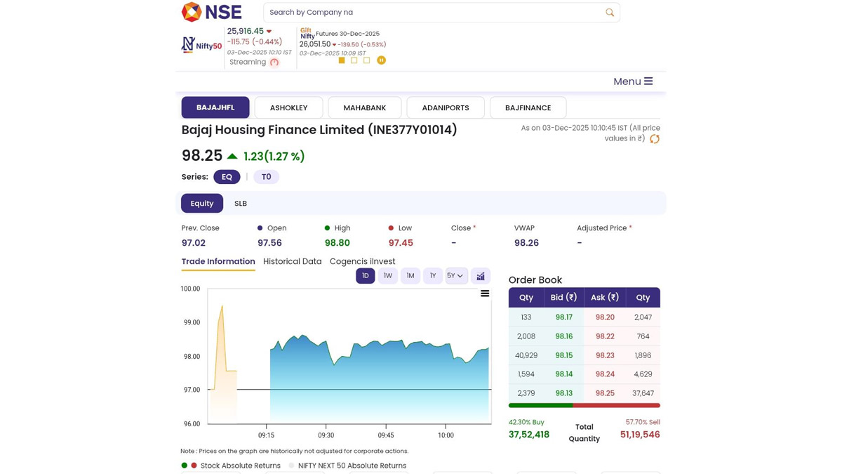 The stocks of Bajaj Housing Finance Limited (NSE: BAJAJHFL) opened in the green on Wednesday, December 3. The stocks of Bajaj Housing Finance were trading at INR 533.45 on December 3. Bajaj Finance Ltd, one of the promoter entities of Bajaj Housing Finance, on Tuesday divested a 2% stake for INR 1,588 crore through an open market transaction. Stocks to Buy or Sell Today, December 3, 2025: Canara Bank, IRFC and Motilal Oswal Among Shares That May Remain in Focus on Wednesday.