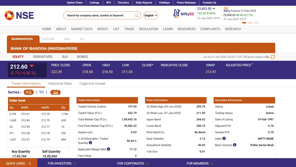 Shares of Bank of Baroda (NSE: BANKBARODA) dropped by 4.40 per cent on January 31, trading at INR 212.60 after opening at INR 218.50, despite reporting a 5.6 per cent year-on-year rise in Q3 profits. The state-owned bank's standalone net profit for Q3FY25 stood at INR 4,837 crore, driven by a 2.8 per cent increase in net interest income (NII) to INR 11,417 crore. However, compared to the previous quarter, both profit and NII saw a decline, with profits dropping by 7.6 per cent and NII down by 1.76 per cent. The decline in stock price reflects the market reaction to the quarterly performance despite the annual profit growth. Suzlon Share Price Today, January 31: Suzlon Shares Jump 5% to INR 58.17 After Previous Session’s Decline.