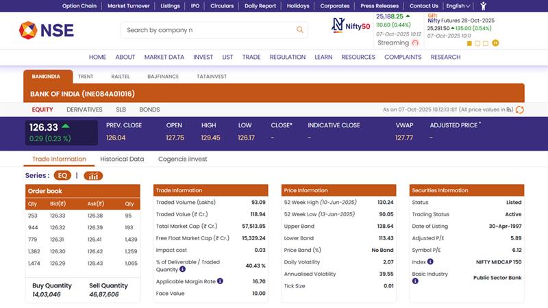 Shares of Bank of India Ltd (NSE: BANKINDIA) inched higher on Tuesday, October 7, following the bank’s strong Q2 FY26 global business growth. The stock opened at INR 127.75 against its previous close of INR 126.04, and by 10:15 AM, it was trading at INR 126.33, up 0.23% in early trade. According to the bank’s provisional quarterly update, domestic deposits rose 8.5% YoY to INR 7.3 lakh crore, while gross domestic advances increased 14.62% to INR 5.97 lakh crore. Globally, Bank of India’s total business grew 11.8% to INR 15.62 lakh crore, with global gross advances rising 13.94% to INR 7.09 lakh crore and global deposits up 10.08% to INR 8.53 lakh crore. The stock has a 52-week high of INR 130.24 and a 52-week low of INR 90.05, indicating moderate volatility. Trent Share Price Today, October 7: Trent Shares Dip 2.08% to INR 4,678 After Q2 FY26 Revenue Report; Check Latest Price on NSE.