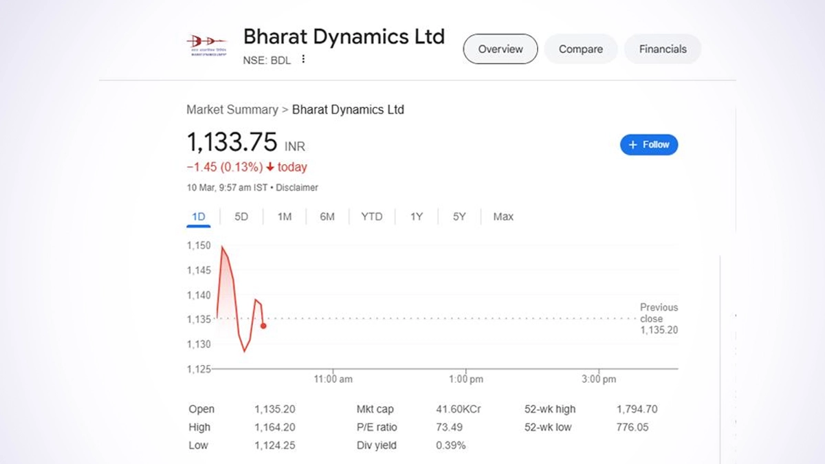 Bharat Dynamics Ltd (NSE: BDL) saw a minor decline in its stock price on March 10, trading at INR 1,133.75, down by 0.13%. The stock opened at INR 1,135.20, reached a high of INR 1,164.20, and touched a low of INR 1,124.25. BDL's market capitalization stands at INR 41,600 crore, with a P/E ratio of 73.49 and a dividend yield of 0.39%. The stock remains significantly below its 52-week high of INR 1,794.70 but is well above its 52-week low of INR 776.05. Gensol Share Price Today, March 10: Gensol Engineering Shares Drop Over 2%, Check Latest Price on NSE.
