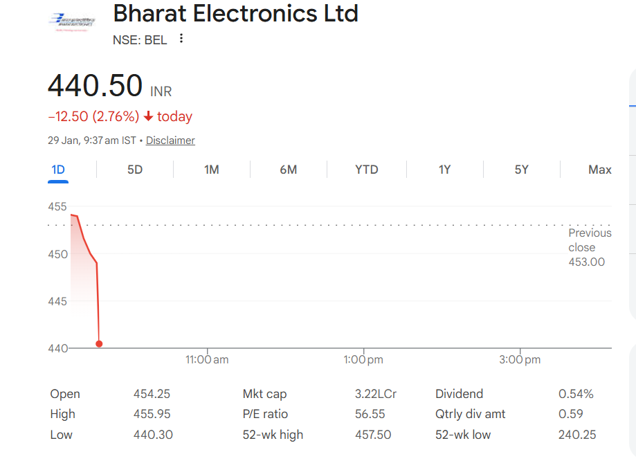 Shares of Bharat Electronics Limited (NSE: BEL) were trading lower on January 29 despite the defence PSU reporting robust financial results for the December quarter. BEL stock was down INR 12.50, or 2.76 per cent, at INR 440.50 on the NSE at 9:37 am IST. On Wednesday, the company reported a consolidated net profit of INR 1,579 crore for Q3 FY26, registering a strong year-on-year growth of 20.4 per cent compared to INR 1,311 crore in the same quarter last year. Revenue from operations rose 24 per cent to INR 7,154 crore during the October–December period, up from INR 5,771 crore a year ago. The stock movement suggests profit booking by investors despite solid earnings performance. Stock Market Holidays February 2026: Full List and Holiday Dates.