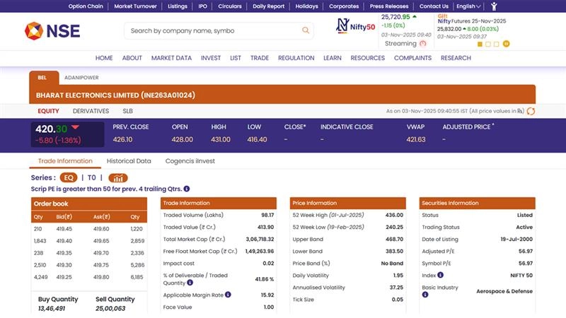 Bharat Electronics Ltd (NSE: BEL) shares dipped 1.36% in early trade on Monday, November 3, despite the company reporting an 18% year-on-year rise in Q2 FY26 profit. The stock opened at INR 428.00, up from the previous close of INR 426.10, but slipped to INR 420.30 by 9:45 AM. BEL shares are trading below their 52-week high of INR 436.00, while the 52-week low stands at INR 240.25. The state-owned defence major posted a consolidated net profit of INR 1,287.16 crore for the July–September quarter, compared to INR 1,092.78 crore a year earlier. Revenue from operations surged 25.8% YoY to INR 5,792.09 crore, while EBITDA rose 22% to INR 1,695.6 crore. However, the EBITDA margin eased to 29.42% from 30.30% YoY, prompting mild profit booking despite strong quarterly earnings. Stocks to Buy or Sell Today, November 3, 2025: BPCL, Urban Company and Patanjali Foods Among Shares That May Remain in Spotlight on Monday.