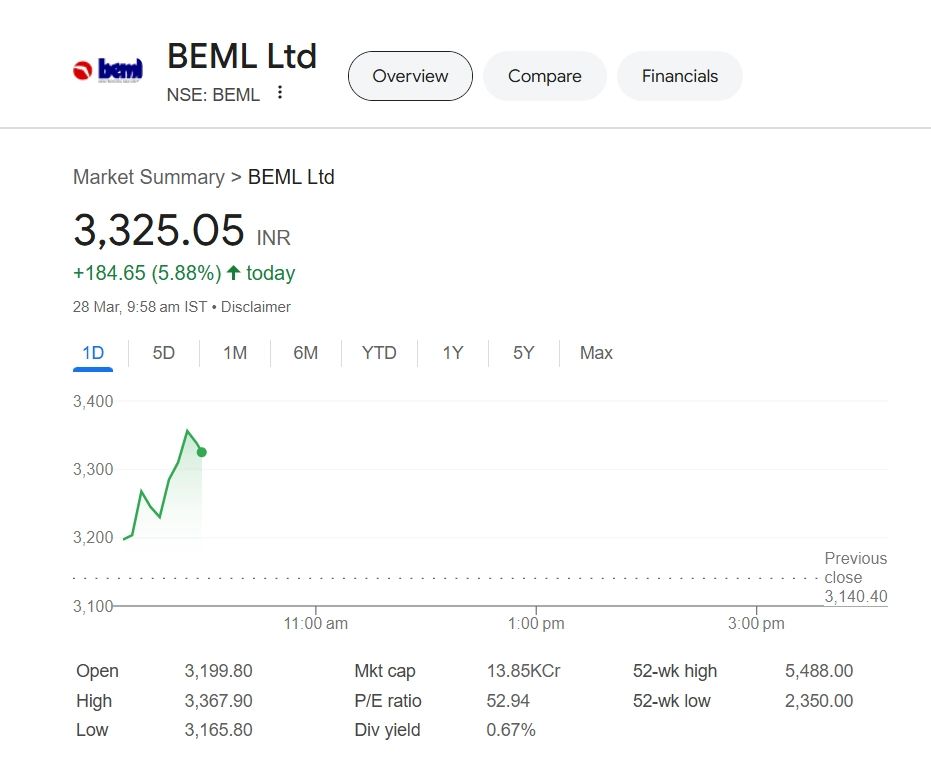 BEML share price (NSE: BEML) soared over 5% to INR 3,314 in Friday’s trading session after securing a INR 405 crore contract from Bengaluru Metro Rail Corporation for manufacturing and supplying standard gauge metro cars. The deal boosts BEML’s position in India’s expanding metro rail sector. Additionally, Motilal Oswal Financial Mutual Fund acquired a stake in BEML through block deals on March 27, further fueling investor confidence. The twin developments have strengthened bullish sentiment around the stock, with analysts expecting continued momentum as the company expands its metro and rail infrastructure business. Stocks To Buy or Sell Today, March 28, 2025: Jio Financial Services, Force Motors, and Asian Paints Among Shares That May Remain in Spotlight on Friday.