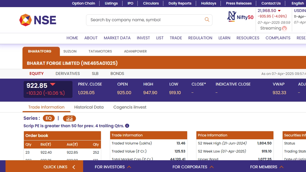 As soon as the stock market opened for business today, April 7, the Indian markets followed the path of the global bloodbath in stock indices as both the indices of India opened with heavy selling pressure. Meanwhile, the stocks of Bharat Forge Limited (NSE: BHARATFORG) opened in the red and were trading at INR 922.85. Notably, Bharat Forge Limited (NSE: BHARATFORG) shares saw a decline of INR 103.20 and fell by 10.06 per cent. Bharat Forge Limited (NSE: BHARATFORG) saw its 52-week high of INR 1,804.50 on June 21 last year. Suzlon Share Price Today, April 7: Stocks of Suzlon Energy Limited Open in Red in Early Trade As Stock Market Opens for Business.