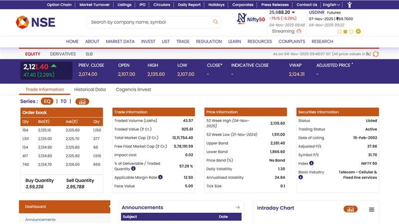 Bharti Airtel Ltd (NSE: BHARTIARTL) witnessed a sharp uptick in early trade on Tuesday, November 4, after its board approved acquiring an additional 5% stake in its telecom infrastructure arm, Indus Towers. The stock opened at INR 2,107.00 against the previous close of INR 2,074.00 and surged 2.29% to INR 2,121.40 by 9:50 AM. The scrip touched a fresh 52-week high of INR 2,135.60, while its 52-week low stands at INR 1,511.00. As of September 30, Bharti Airtel holds a 51.03% stake in Indus Towers, while public shareholders own 48.93%. The proposed stake acquisition, valued at over INR 5,000 crore based on Indus Towers’ Monday closing price of INR 382.70, will be completed in tranches depending on market conditions. Stocks to Buy or Sell Today, November 4, 2025: Bharti Airtel, Zydus Lifesciences, and Cipla Among Shares That May Remain in Spotlight on Tuesday.