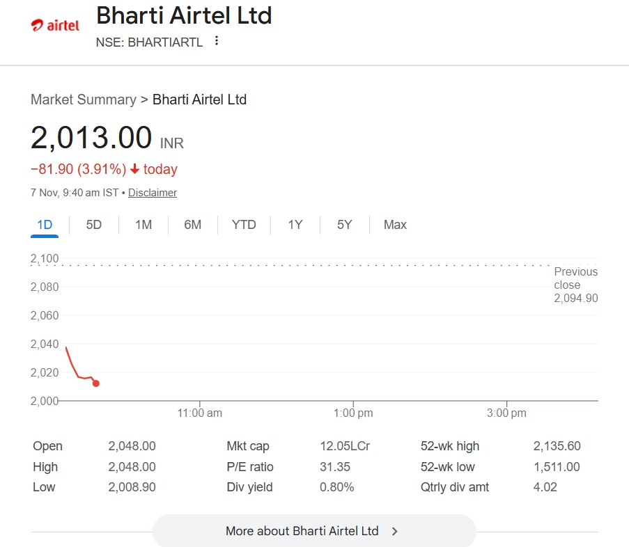 Bharti Airtel shares tumbled 3.9% to INR 2,013 on Thursday after reports surfaced that Singapore Telecommunications Ltd (Singtel) plans to offload part of its holding in the telecom major. Singtel’s subsidiary, Pastel Ltd, is reportedly set to sell about 5.1 crore shares—equivalent to around 0.8% of Bharti Airtel’s equity—through a large block deal valued at approximately INR 10,300 crore. The stake sale marks Singtel’s continued portfolio rebalancing in India’s telecom space. Market participants said the deal could weigh on Airtel’s short-term sentiment, though analysts remain positive on the company’s fundamentals, citing strong earnings momentum and improving average revenue per user (ARPU) trends. Stocks to Buy or Sell Today, November 7, 2025: RVNL, Bajaj Housing Finance, and Crompton Greaves Among Shares That May Remain in Spotlight on Friday.