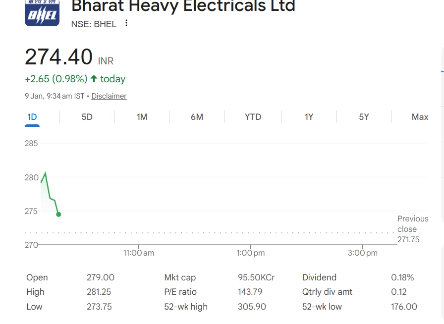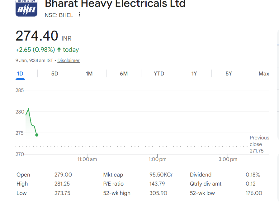 Bharat Heavy Electricals Ltd (NSE: BHEL) shares were trading higher in early market hours on January 9. The stock was quoted at INR 273.90, up INR 2.15 or 0.79%, at around 9:34 am IST. Buying interest was seen amid positive sentiment around PSU stocks and expectations of fresh order inflows in the power and infrastructure segments. Investors are closely tracking BHEL’s execution pace, order book updates, and government-led capex momentum for further cues on the stock’s near-term direction. Stocks to Buy or Sell Today, January 9, 2026: RVNL, BHEL, and Vedanta Among Shares That May Remain in Spotlight on Friday.