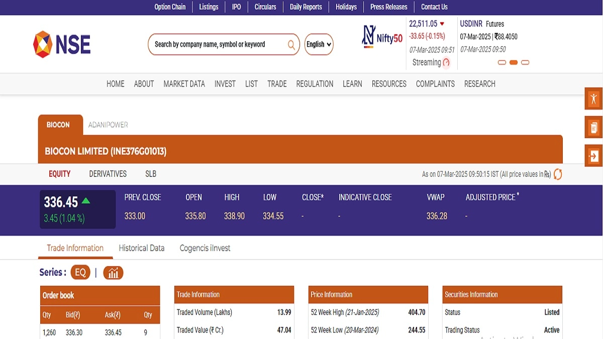 Stocks of Biocon Limited (NSE: Biocon) opened in green today, March 7, during the early morning trade. According to the National Stock Exchange (NSE) website, shares of Biocon Limited (NSE: Biocon) were trading at INR 336.45 and rose by INR 3.45 or 1.04 per cent. Biocon Limited (NSE: Biocon) saw its 52-week high of INR 404.70 on January 21 this year and 52-week low of INR 244.55 on March 20 last year. Stocks To Buy or Sell Today, March 7, 2025: RVNL, NMDC, Bajaj Finserv Among Shares That May Remain in Focus on Friday.