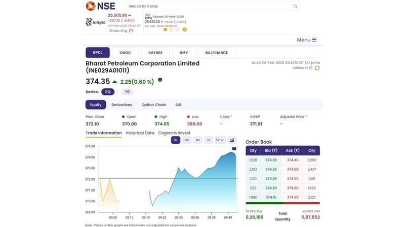 BPCL (NSE: BPCL) stocks opened on a positive note today, Tuesday, February 24, as soon as the stock market opened for trading. According to the National Stock Exchange (NSE) website, shares of Bharat Petroleum Corporation Limited (BPCL) (NSE: BPCL) were trading at INR 374.35 and rose by INR 2.25 or 0.60 per cent. In a post-market hours exchange filing on Monday, BPCL said the Adjudicating Authority passed the order on February 21, 2026. The total financial implication of INR 1,816.65 crore includes a duty demand of INR 476.94 crore, applicable interest of about INR 1,339.70 crore calculated to date and a penalty of INR 95,000. The company said the matter relates to 19 show cause notices issued by the Central Excise Department regarding the determination of transaction value under the Central Excise law for the period from September 2004 to May 2010. Stocks To Buy or Sell Today, February 24, 2026: Bharti Airtel, Waaree Energies and Lupin Among Shares That May Remain in Focus on Tuesday.
