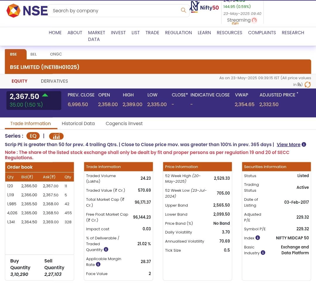 BSE Limited (NSE: BSE) stocks opened in the green today, May 23, soon after the Indian stock market opened for trading. According to the National Stock Exchange (NSE), shares of BSE (NSE: BSE) were trading at INR 2,367.50 and rose by INR 35 or 1.50 per cent. Stocks To Buy or Sell Today, May 23, 2025: RBL Bank, Ultratech Cement, Jio Financial Among Shares That May Remain in Focus on Friday.