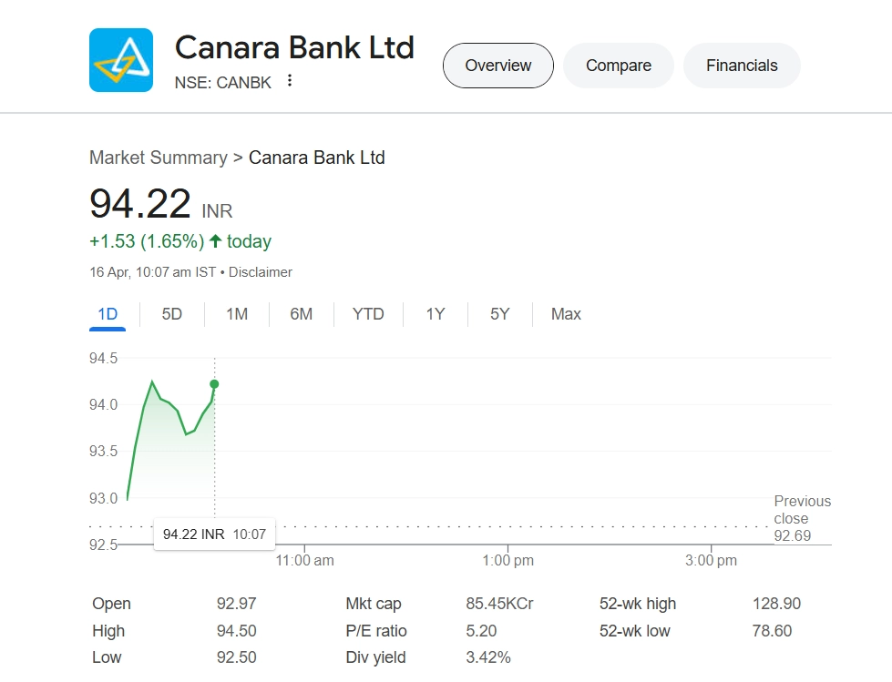 Canara Bank share price (NSE: CANBK) saw a positive start on April 16, trading at INR 94.22, up INR 1.53 or 1.65% as of 10:07 AM IST on the NSE. The public sector bank’s stock is gaining momentum amid broader market stability and optimism around banking sector performance. Investors are closely watching PSU bank counters ahead of the upcoming quarterly earnings season. Canara Bank has shown steady movement in recent sessions, with analysts expecting improved asset quality and loan growth to support future gains. Market participants are advised to track volume trends and key resistance levels. Stocks To Buy or Sell Today, April 16, 2025: IndusInd Bank, IREDA and Gensol Engineering Among Shares That May Remain in the Spotlight on Wednesday.