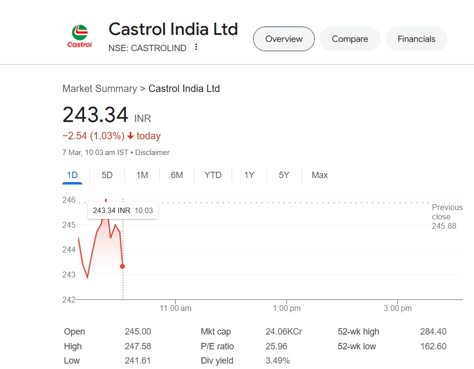 As of 10:03 AM IST on March 7, 2025, Castrol India share price (NSE: CastrolInd) is trading at INR 243.34 on the National Stock Exchange (NSE), reflecting a decrease of INR 2.54 (1.03%) from the previous close. The stock experienced a significant surge on March 6, 2025, rising over 10% amid reports that Saudi Aramco is considering a potential bid for BP Plc’s lubricant assets, which include the Castrol brand. This development has attracted considerable investor attention, leading to increased trading volumes and a notable uptick in share price. Stocks To Buy or Sell Today, March 7, 2025: RVNL, NMDC, Bajaj Finserv Among Shares That May Remain in Focus on Friday.