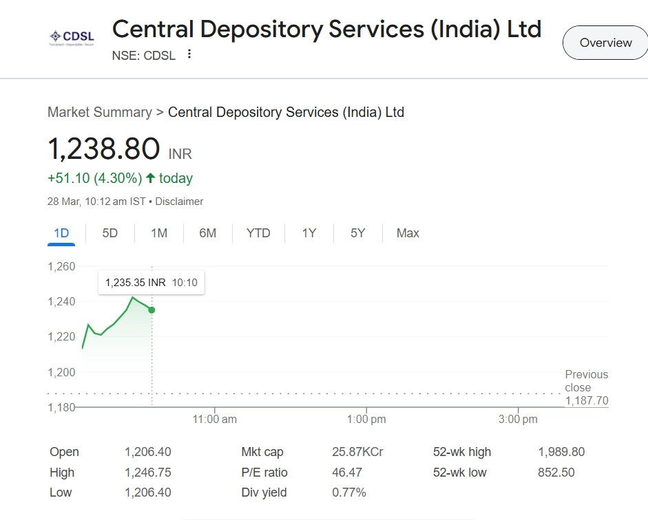 Central Depository Services (India) Ltd (CDSL) share price (NSE: CDSL) surged 4.30% to INR 1,238.80 in early trade on March 28, driven by strong investor interest. The rally comes amid positive market sentiment and increasing retail participation in stock markets, benefiting depository service providers like CDSL. Analysts remain optimistic about CDSL’s growth prospects, citing rising demat account openings and sustained trading activity. The stock has shown strong momentum, with investors closely watching for further upside in the coming sessions. Stocks To Buy or Sell Today, March 28, 2025: Jio Financial Services, Force Motors, and Asian Paints Among Shares That May Remain in Spotlight on Friday.