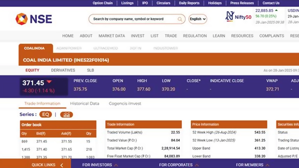 Stocks of Coal India Limited (NSE: Coal India) opened on a negative note today, January 28. According to the latest trading updates on the National Stock Exchange (NSE) website, Coal India Limited (NSE: Coal India) shares were trading at INR 371.45 and saw a decline of INR 4.30 or 1.14 per cent. Notably, Coal India Limited (NSE: Coal India) saw its 52-week high of INR 543.55 on August 26 last year. Stocks To Buy or Sell Today, January 28, 2025: ITC, Tata Power, and Coal India Among Shares That May Remain in Spotlight on Tuesday.