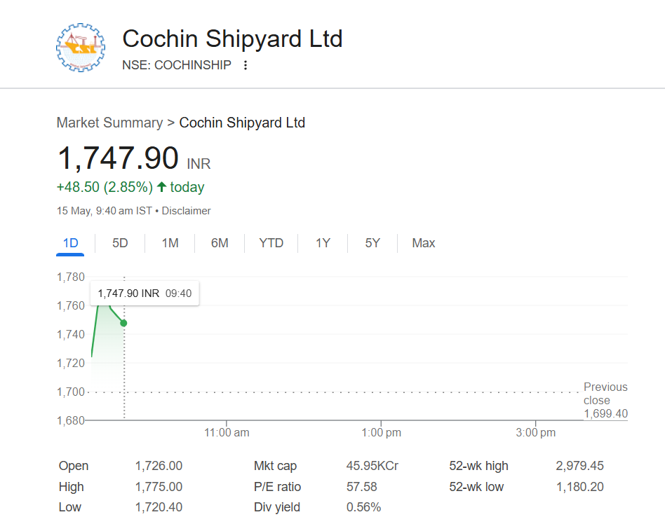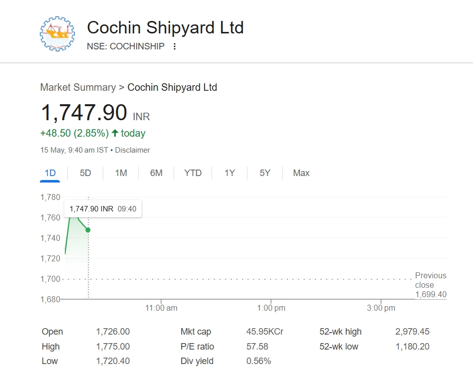 Cochin Shipyard share price (NSE: CochinShip) surged in early trade on May 15, gaining 2.85% to reach INR 1,747.90 on the NSE at 9:40 am. The rally reflects strong investor sentiment amid broader market positivity and ongoing momentum in defence and shipbuilding stocks. The stock added INR 48.50 to its previous close, continuing its upward trend. Analysts remain optimistic, citing the company’s robust order book and government support for domestic shipbuilding initiatives. Stocks To Buy or Sell Today, May 15, 2025: Eicher Motors, Apollo Tyres, Sanofi India and Tata Power Among Shares That May Remain in Focus on Thursday.