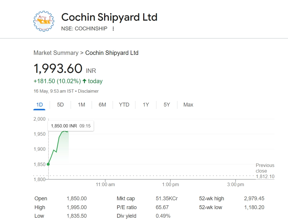 Cochin Shipyard share price (NSE: COCHINSHIP) soared 10.02% in early trade on May 16, hitting INR 1,993.60 on the NSE by 9:53 am IST, up INR 181.50 from the previous close. The rally is driven by strong investor sentiment and optimism around the company’s robust order book and strategic growth in the defense and shipbuilding sectors. Analysts see continued momentum if positive developments sustain, making it one of the top gainers in morning trade. Stocks To Buy or Sell Today, May 16, 2025: Abbott India, Godrej Industries, Crompton Greaves and JSW Energy Among Shares That May Remain in Spotlight on Friday.