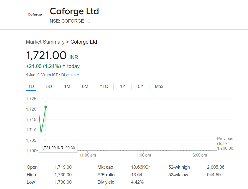Coforge share price (NSE: COFORGE) opened on a positive note on Tuesday, June 4, climbing 1.12% to trade at INR 1,719 on the NSE by 9:30 AM IST. The stock gained ₹19 from its previous close, reflecting renewed investor interest. The upward movement comes amid steady market conditions and positive sentiment around the IT sector. Investors are closely watching Coforge’s performance as it continues to show resilience despite broader market volatility. Stocks To Buy or Sell Today, June 04, 2025: Ola Electric Mobility, Tata Technologies and Wipro Among Shares That May Remain in Spotlight on Wednesday.